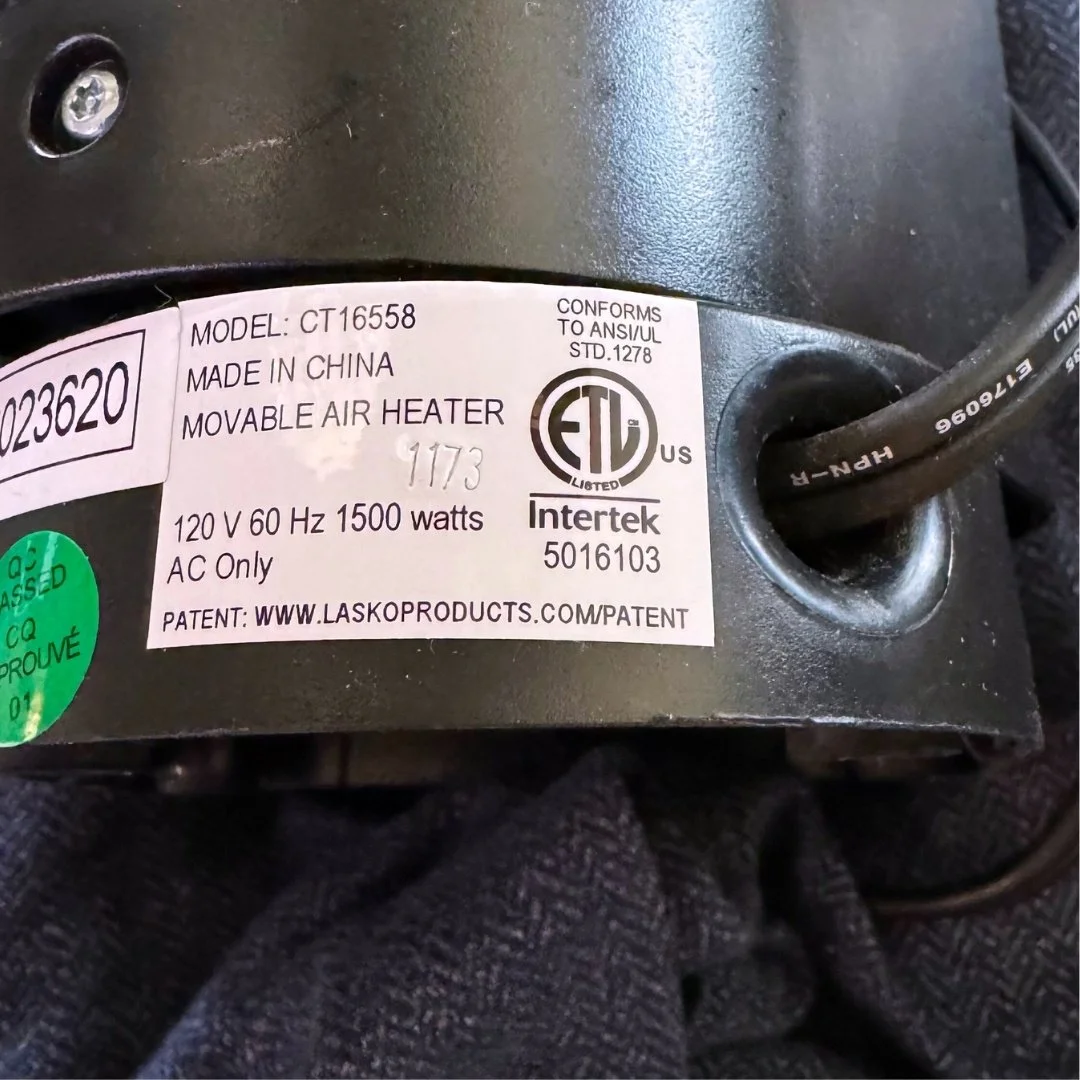 The label "120V 60Hz 1500W AC only" on a heater gives important information about the electrical requirements: