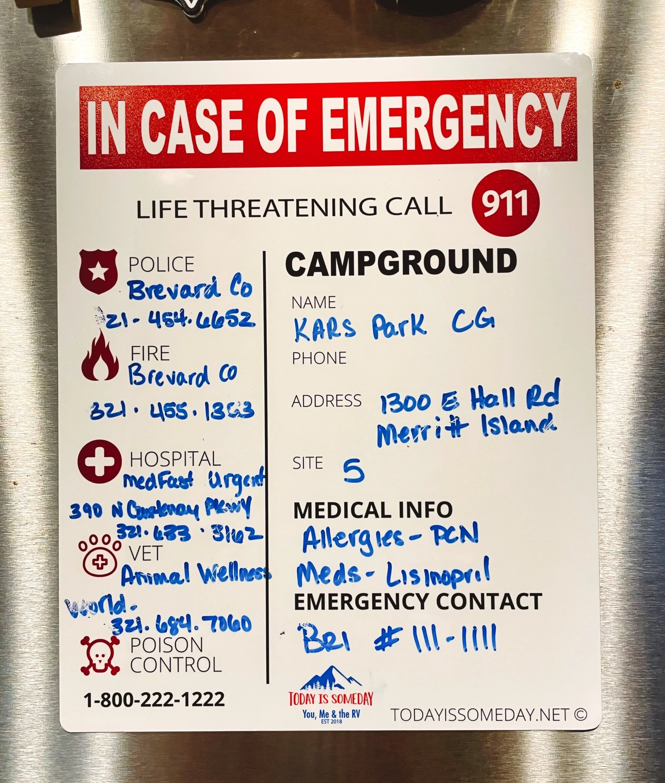 I have created an Emergency RV Magnet so you can keep all this important information in one location, so everyone will know exactly where the info is during an emergency. Just fill it out and hang it on the fridge. If you don’t have a residential fridge add a couple of 3M tabs on the back and hang it inside a cabinet door.