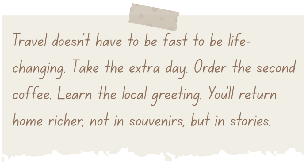 You don’t have to go far to experience something new. Wander a little longer, listen a little deeper, and let each place introduce itself to you. Travel isn’t about seeing more. It’s about feeling more.